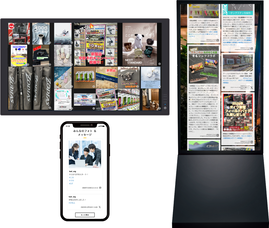 SNSの投稿を取得して、サイネージを自動更新。NGワードや検閲などの安心機能も充実。